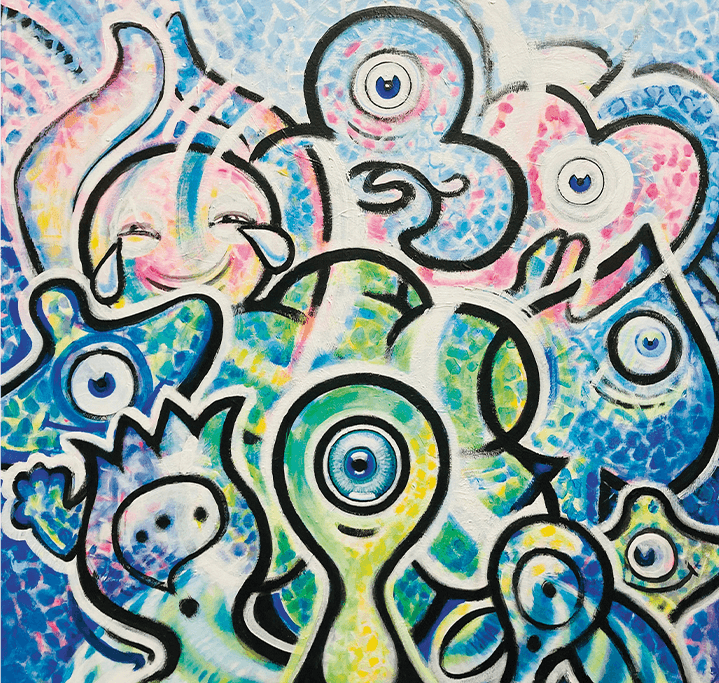 His style combines expressionism, pop art, street art and symbolism— at the same time, the art he makes is profoundly unique. By inventing original characters and creating an extraordinary visual landscape, one that is purposefully exotic, he challenges the viewer to step outside of their comfort zone, asking us to confront and overcome unseen prejudices. His artistic practice seeks to cultivate the radical acceptance he wishes for the world.